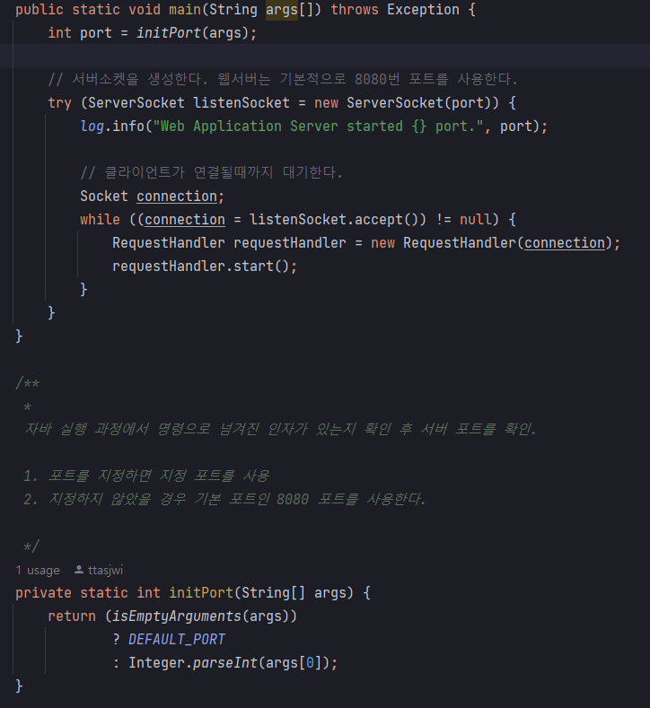 우리 WAS에서는 외부의 고객 요청 메시지를 받을 수 있게 TCP/IP 서버소켓을 만들고 고객의 요청 메시지를 언제든 받아들일 수 있어야합니다. (이 소스 코드는 간단한 상황을 가정했지, 실제로는 복수의 클라이언트로부터 오는 요청을 유연하게 처리할 수 있도록 복잡한 멀티스레드 응답 환경도 제어해야합니다.)