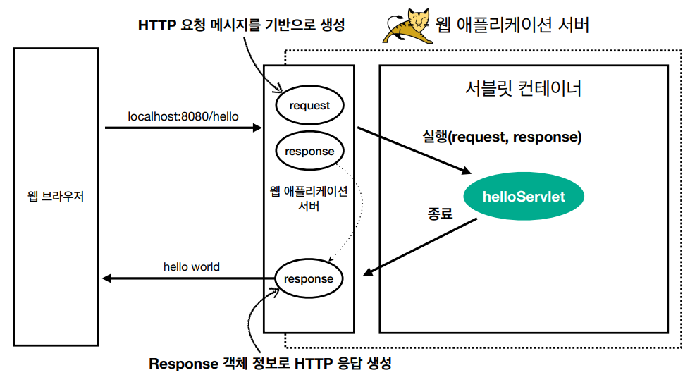 Http 요청/응답에 관한 복잡한 처리로직을 이제 서블릿 컨테이너에게 위임했습니다. (아까부터 서블릿 컨테이너라는 말이 새로 나와서 헷갈릴 수 있는데 이 부분은 아래에서 설명하겠습니다.)