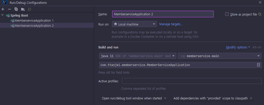Run/Debug Configuration에서 기본적인 실행 설정을 복제하고(실행 설정을 선택한 상태에서 왼쪽 상단 세번째에 위치한 copy configuration버튼을 누르면 실행 설정이 복제됩니다.) 각각 1,2로 이름을 붙입니다.