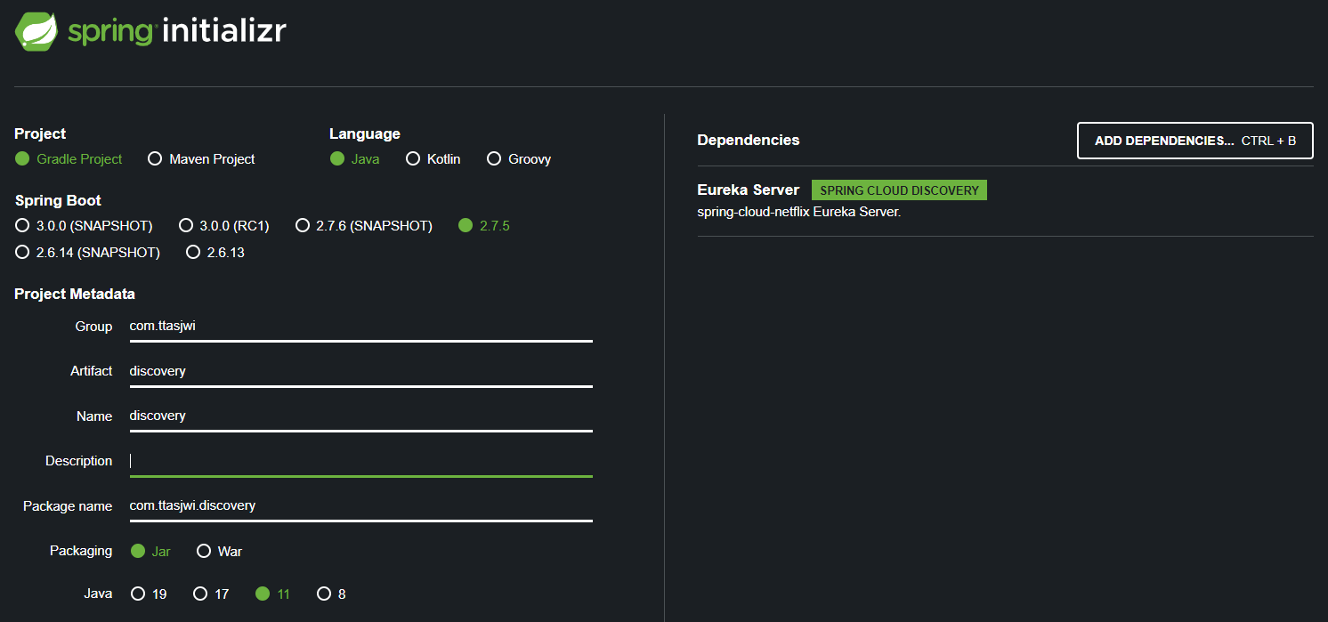start.spring.io 또는 Spring initializer를 통해 스프링 프로젝트를 생성하면 되고, Dependencies에 Eureka Server를 추가합니다.