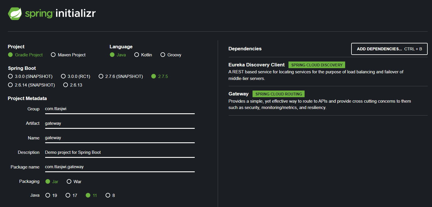 Dependencies에는 Spring Cloud Gateway, Eureka Discovery Client를 추가합니다.