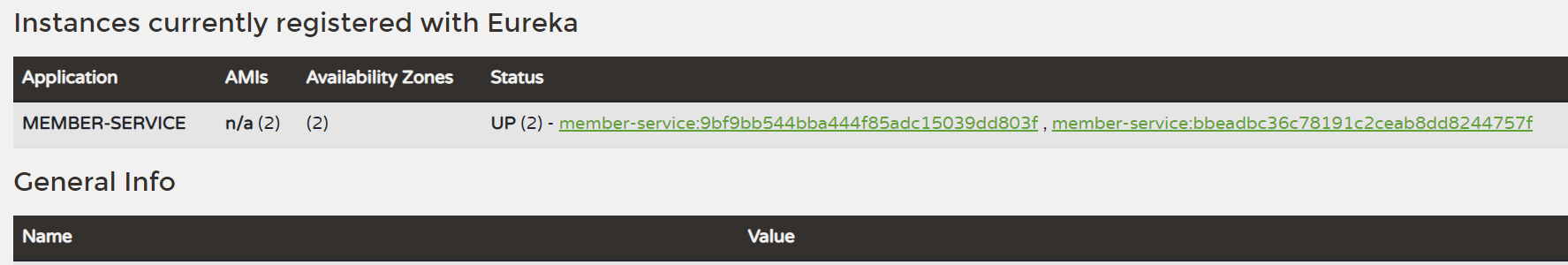 서비스 인스턴스를 2개 실행하면, 위와 같이 MEMBER-SERVICE 서비스명 아래에 인스턴스 2개가 등록된 것을 확인할 수 있습니다.